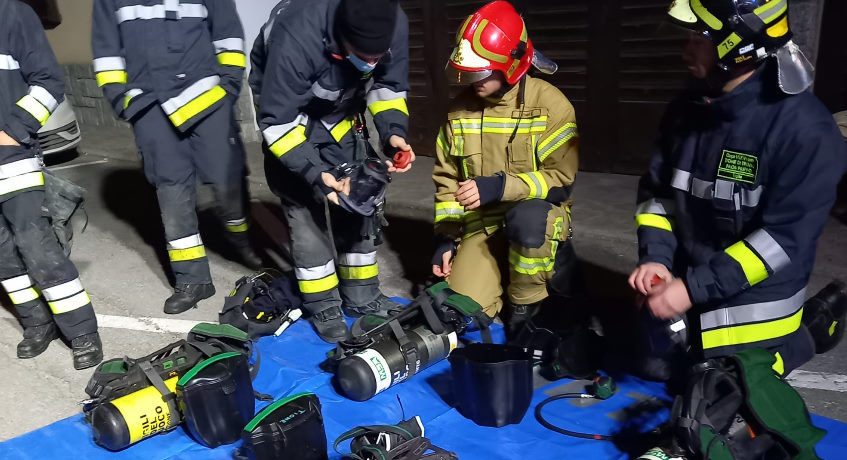 Natürlich lies er sich es nicht nehmen, den Einladungen der Freiwilligen Feuerwehren „Vigili del Fuoco Volontari Unione Distrettuale delle Giudicarie Tione di Trento“ und „Vigili del Fuoco Volontari Porte di Rendena“ zu folgen und am aktiven Übungsdienst der beiden italenischen Feuerwehren teilzunehmen. Neben der Einweisung in verschiedene Fahrzeuge der Wehren durfte er auch an einer Atemschutzausbildung teilnehmen.