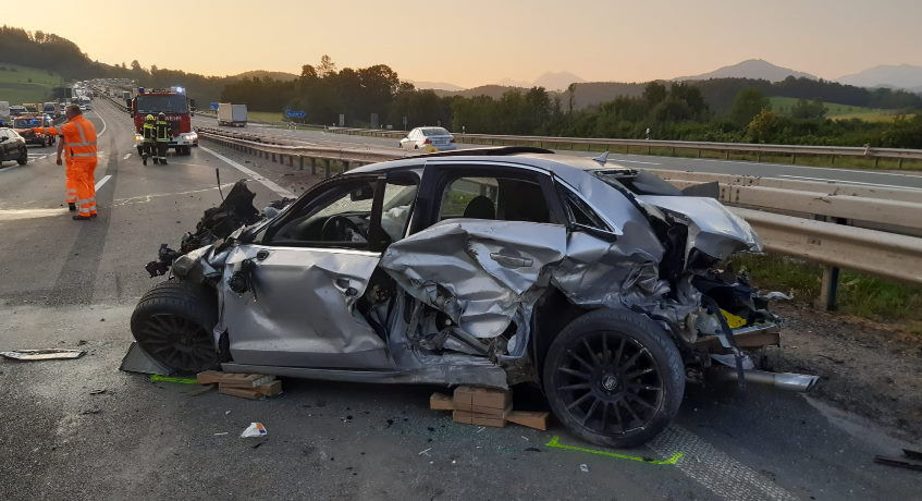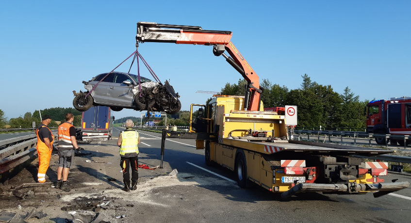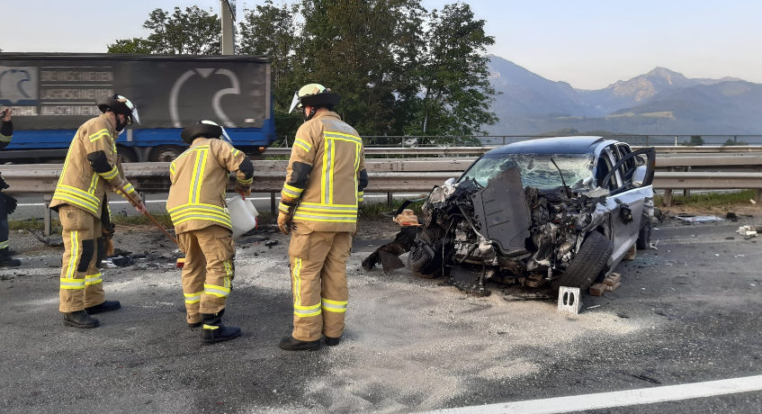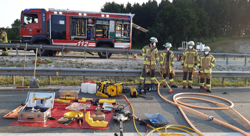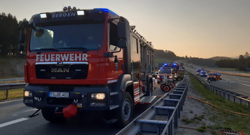 21.07.2021 Am heutigen frühen Morgen wurde die Feuerwehr Bergen zu einem schweren Verkehrsunfall auf die Autobahn A8 an der Anschlussstelle Bergen in Fahrtrichtung München alarmiert. Ein PKW war bei einem Ausweichmanöver mit einem LKW kollidiert und schleuderte mehrfach gegen die Mittelleitplanke, bevor er auf der Fahrbahn zum Stehen kam. Der Fahrer in dem PKW wurde dabei mit Verletzungen unbekannten Grades in seinem Auto eingeschlossen und musste von der Feuerwehr Bergen mit dem hydraulischen Rettungsspreizer befreit werden. Die Fahrer des LKWs und eines weiteren beteiligten PKWs blieben glücklicherweise unverletzt. Neben der Befreiung des Patienten streute die Feuerwehr Bergen ausgelaufene Betriebsstoffe ab und reinigte die Fahrbahn. Während der Bergungsarbeiten war die Autobahn in Richtung München für mehrere Stunden komplett gesperrt. Die ebenfalls alarmierten Feuerwehren Holzhausen, Siegsdorf, Grabenstätt und Traunstein konnten nach und nach aus dem Einsatz wieder herausgelöst werden.