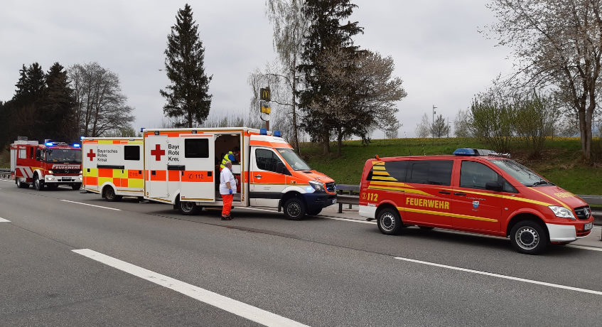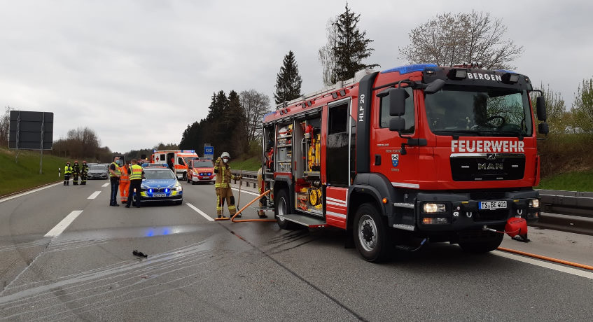 01.05.2021 Die Feuerwehr Bergen wurde am heutigen Samstag Nachmittag zu einem Verkehrsunfall auf die Autobahn A8 zwischen den Anschlussstellen Bergen und Grabenstätt in Fahrtrichtung München alarmiert. Bei dem Unfall waren insgesamt 3 Autos beteiligt, wobei ein PKW über die Fahrbahn in die Mittelleitplanke schleuderte und quer zur Fahrbahn stehen blieb. Der Fahrer dieses PKWs wurde leicht verletzt ins Krankenhaus eingeliefert, die Insassen der anderen Fahrzeuge blieben unverletzt. Die Feuerwehr Bergen stellte den Brandschutz sicher, streute ausgelaufene Betriebsstoffe ab und reinigte die Fahrbahn. Während der Bergungsarbeiten war die Autobahn in Fahrtrichtung München kurzzeitig komplett gesperrt. Neben der Feuerwehr Bergen waren noch die Feuerwehren Holzhausen, Grabenstätt und Siegsdorf mit ihrem Verkehrssicherungsanhänger alarmiert.