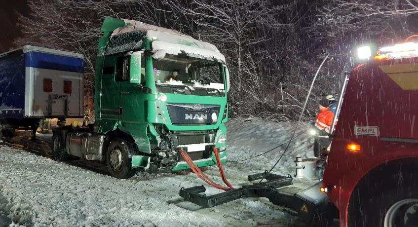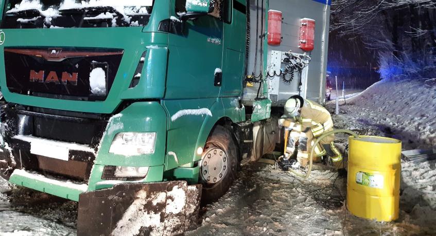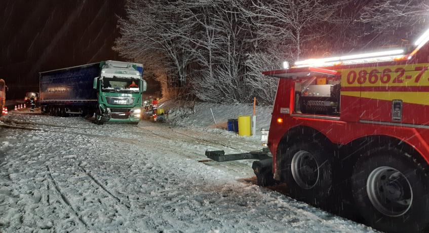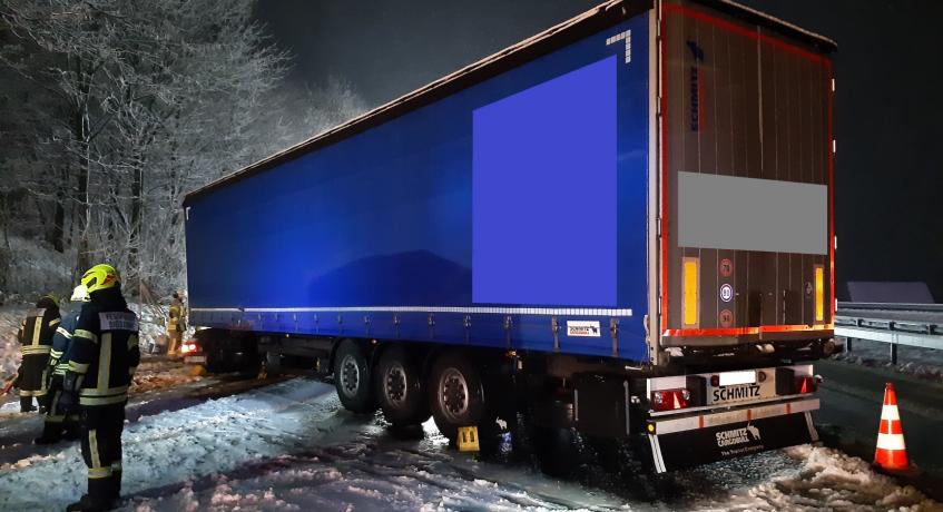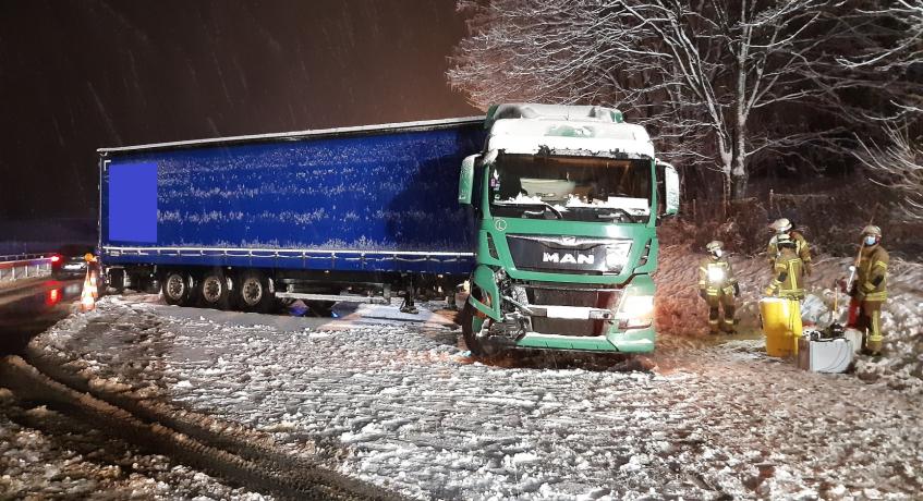 Kurz vor der Anschlussstelle Siegsdorf-West geriet ein mit Papierrollen beladener Sattelzug auf schneeglatter Straße ins Schleudern, prallte in die Mittelleitplanke und blieb anschließend entgegen der Fahrtrichtung auf der rechten Fahrspur stehen. Dabei wurde der Dieseltank der Zugmaschine aufgerissen. Die Feuerwehr Bergen pumpte den verbliebenen Diesel im Tank ab, stellte den Brandschutz sicher und streute zusammen mit der Feuerwehr Siegsdorf den ausgelaufenen Treibstoff ab. Die beiden Fahrzeuginsassen im LKW blieben glücklicherweise unverletzt. Während der Bergungsarbeiten war die Autobahn für ca. 1,5 Stunden nur einspurig befahrbar.