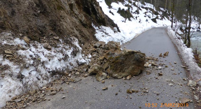 Mehrere größere Steinbrocken lösten sich von der Böschung und versperrten die Straße. Die Feuerwehr und der Bauhof Bergen beseitigten die Steine mit schwerem Räumgerät. Während der Arbeiten wurde die Straße von der Feuerwehr für den Verkehr komplett gesperrt. Nach der Begutachtung der Böschung durch einen Geologen konnte die Straße wieder freigegeben werden.