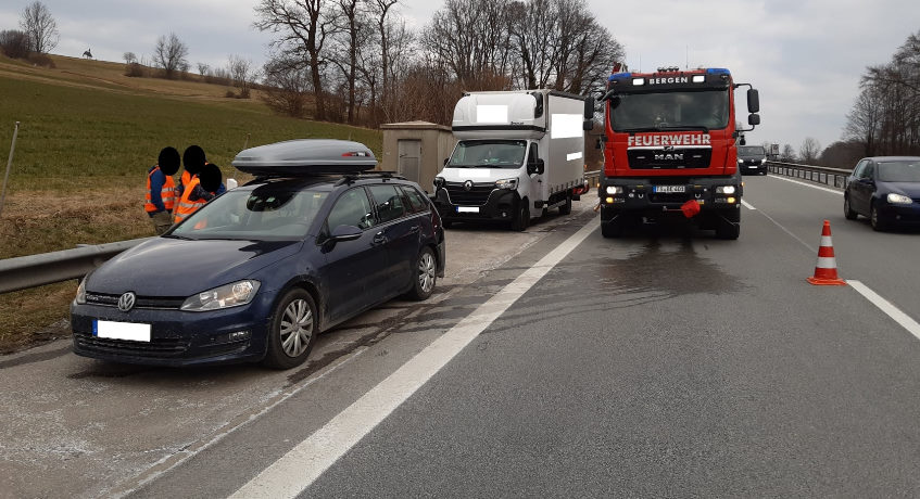 Drei Fahrzeuge, darunter ein PKW, ein Klein-LKW sowie ein weiterer PKW mit Anhänger, waren aufeinander gefahren. Die insgesamt 10 Insassen in den drei beteiligten Fahrzeugen blieben glücklicherweise alle unverletzt. Die Feuerwehr Bergen stellte den Brandschutz sicher, streute ausgelaufene Betriebsstoffe ab und reinigte die Fahrbahn. Die Freiwillige Feuerwehr Siegsdorf sicherte mit ihrem Verkehrssicherungsanhänger die Einsatzstelle ab. Die ebenfalls alarmierten Feuerwehren aus Holzhausen und Freiwillige Feuerwehr Grabenstätt konnten nach kurzer Zeit wieder aus dem Einsatz entlassen werden. Die Autobahn war während der Bergungsarbeiten mehrmals komplett gesperrt. Aufgrund des starken Reiseverkehrs zum Ferienende bildete sich dadurch schnell ein kilometerlanger Stau