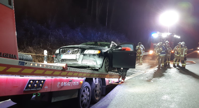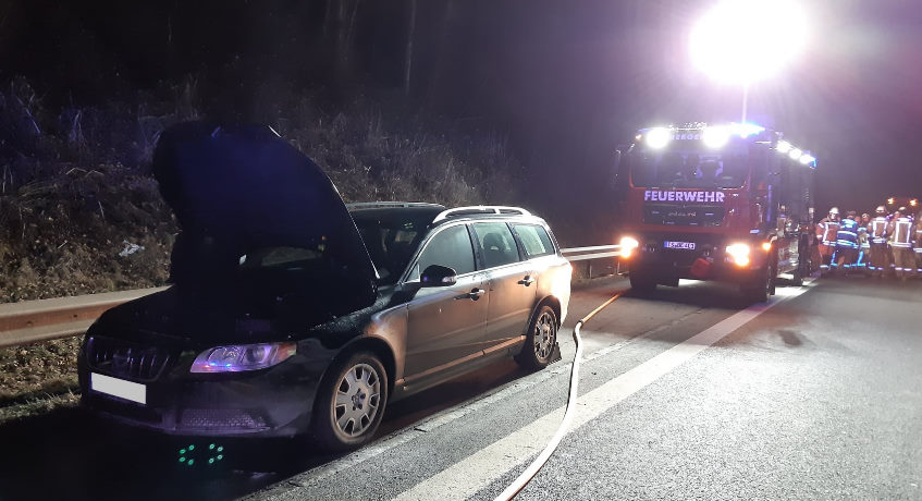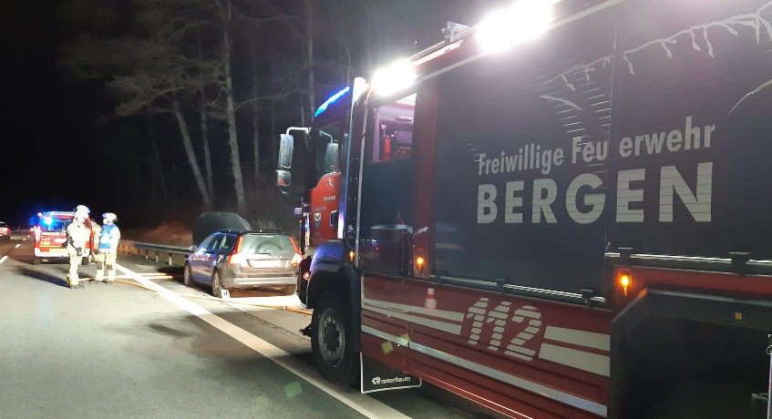 Aufgrund eines technischen Defekts fing der Motorraum plötzlich Feuer. Die beiden Insassen konnten sich unverletzt aus dem Fahrzeug retten. Dem beherzten Eingreifen einer zufällig vorbeifahrenden Streife der Bundespolizei ist es zu verdanken, dass der Brand bis zum Eintreffen der Feuerwehr bereits mit einem Feuerlöscher gelöscht werden konnte. Die Feuerwehr Bergen übernahm die Nachlöscharbeiten, kontrollierte den Motorraum mit der Wärmebildkamera, leuchtete die Einsatzstelle aus und reinigte die Straße. Die ebenfalls alarmierten Feuerwehren aus Holzhausen, Freiwillige Feuerwehr Siegsdorf und Freiwillige Feuerwehr Grabenstätt konnten nach kurzer Zeit wieder aus dem Einsatz entlassen werden.
