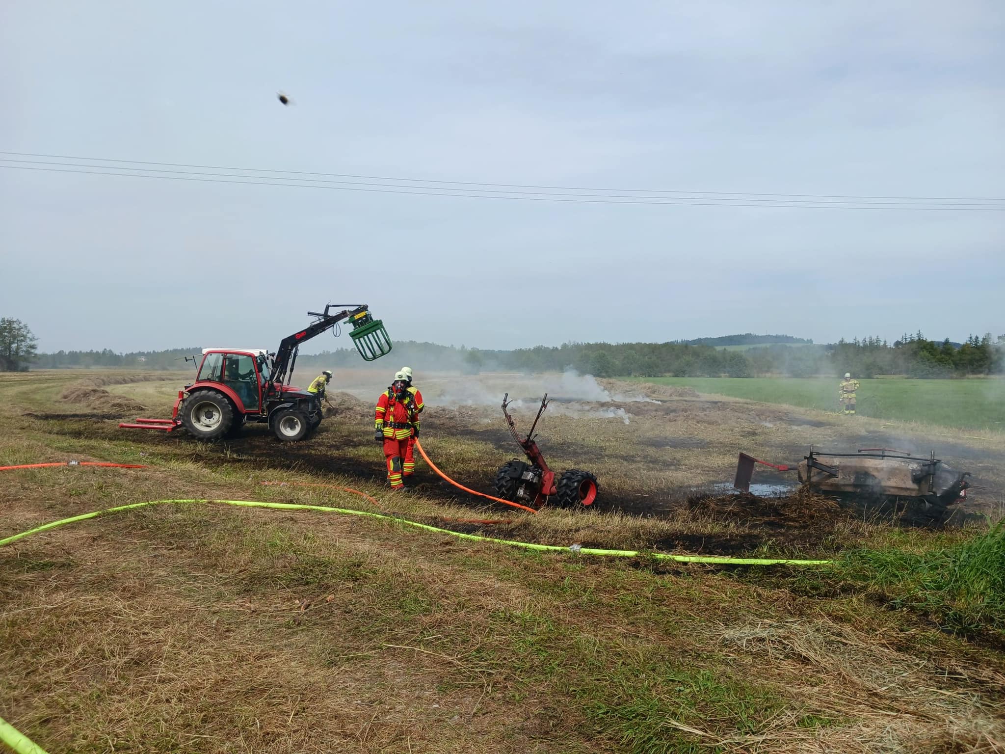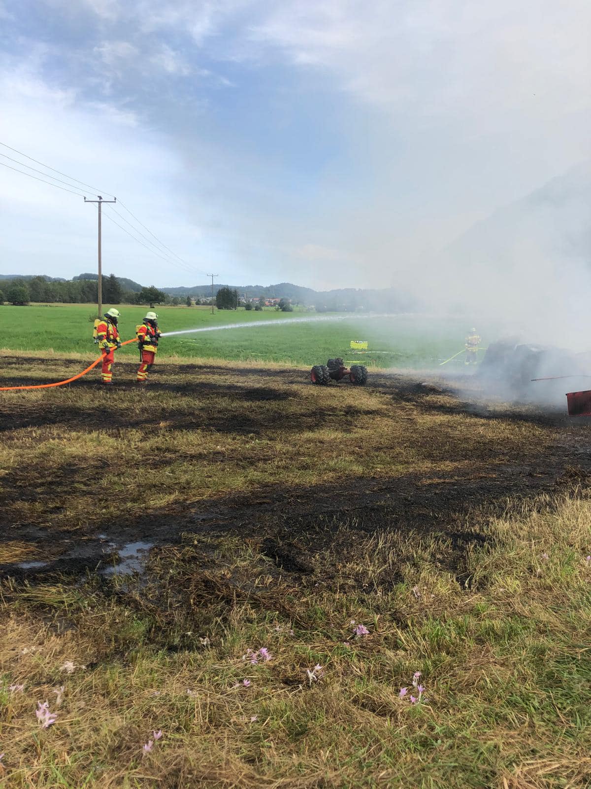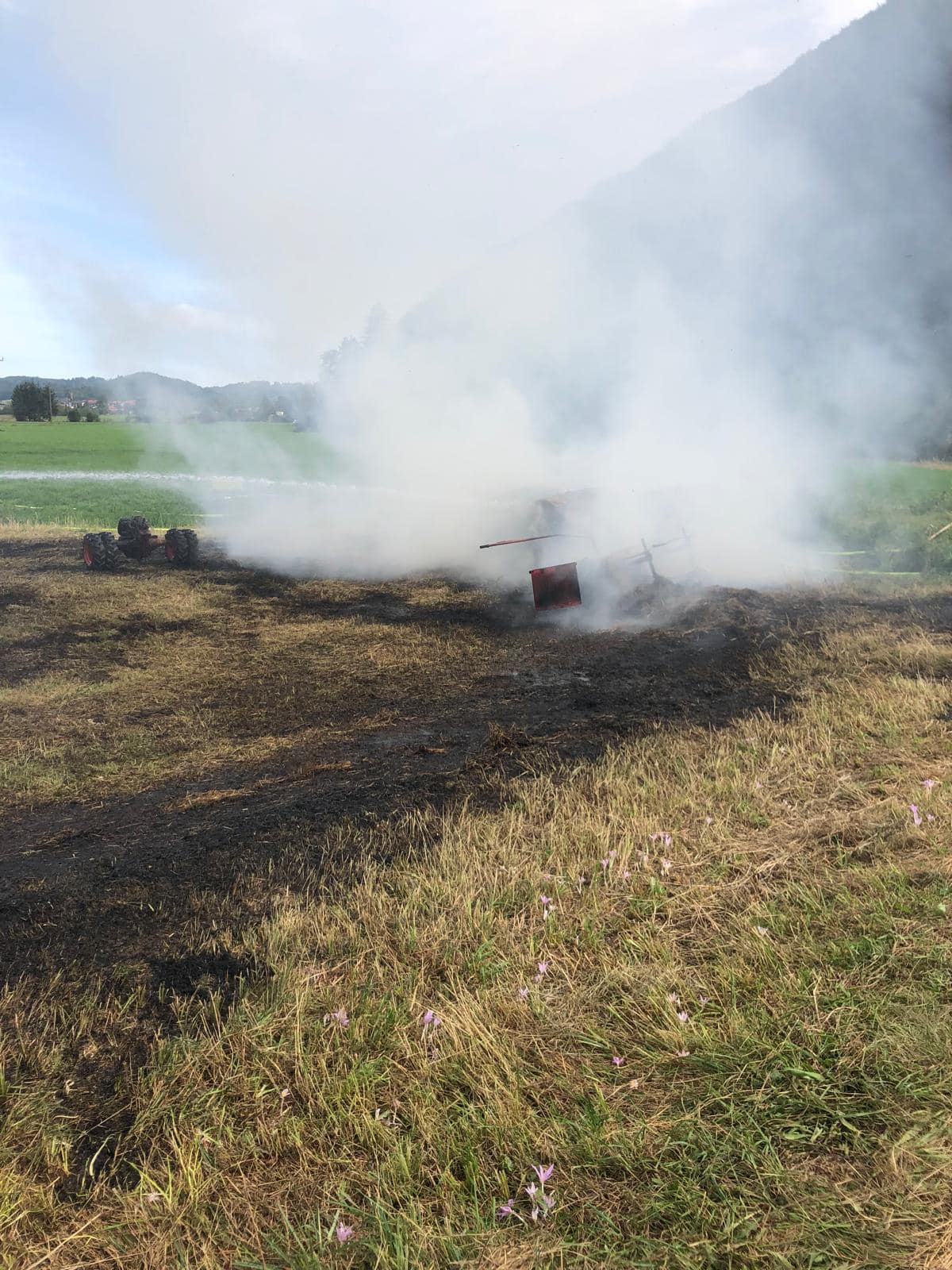 Bei Mäharbeiten auf einem Feld ist es zu einem technischen Defekt an einer Heuraupe gekommen. Dadurch gerieten mehrere Heuballen und etwa 350 Quadratmeter der anliegenden Streuwiese in Brand.
