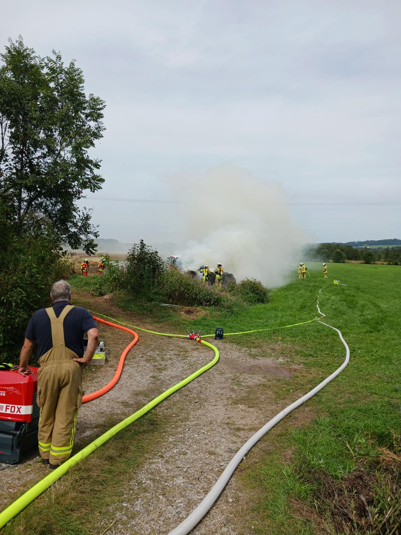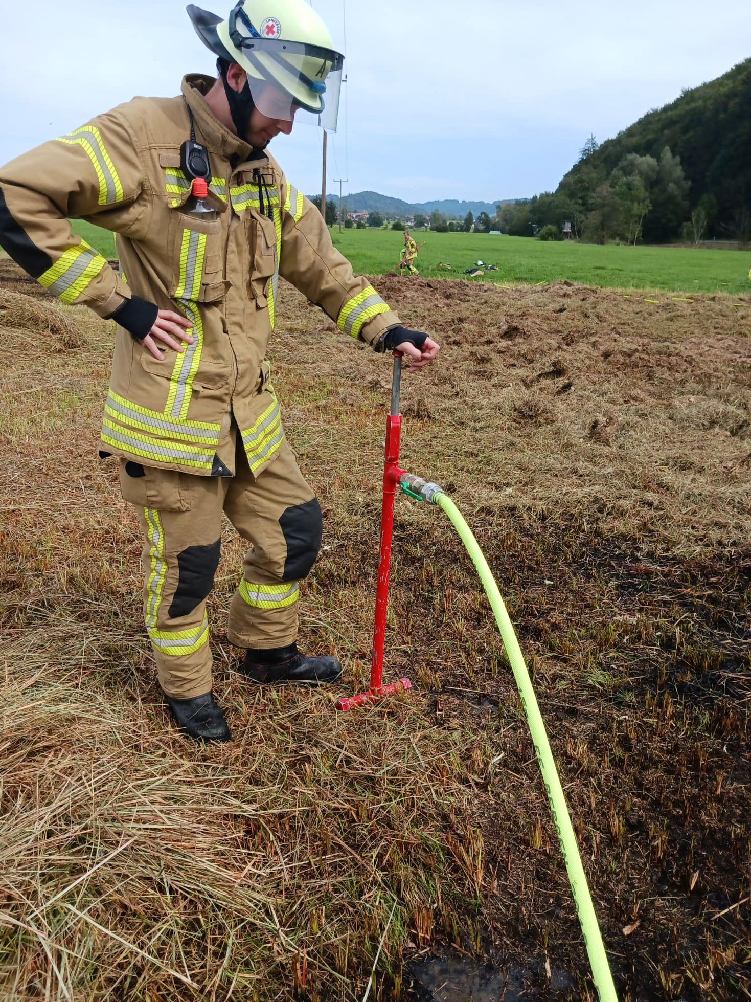 Das Heu wurde auf dem Boden ausgebreitet, um den Löschvorgang zu fördern und mögliche Glutnester zu beseitigen. Um Glutnester in der Tiefe der Streuwiese zu löschen, kamen spezielle Löschlanzen zum Einsatz. Ein benachbarter Landwirt unterstützte die Löscharbeiten mit seinem Traktor. Mit uns im Einsatz waren die Freiwilligen Feuerwehren Staudach-Egerndach und Grassau.