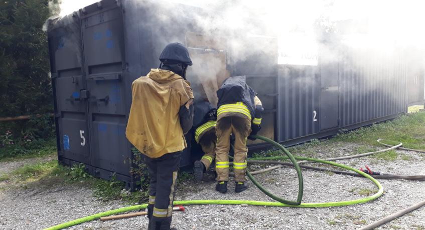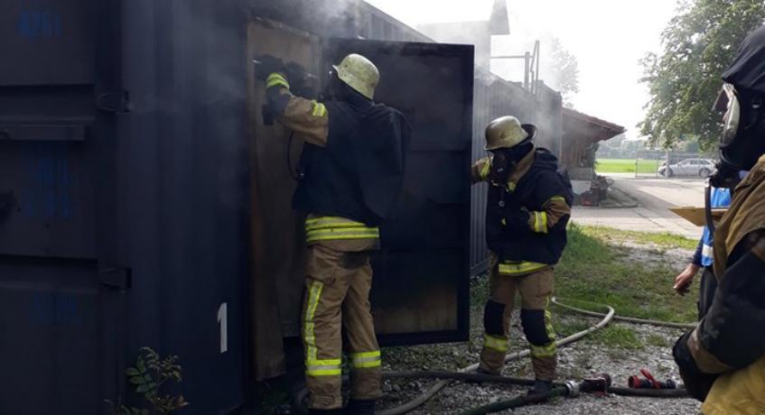 Den Schwerpunkt des Lehrgangs bildeten die Durchgänge im Brandcontainer, bei denen alle Phasen eines Brandes vom Entstehungsbrand bis zum Vollbrand und die damit verbundenen verschiedenen Rauchschichten demonstriert wurden. Dabei wurde auch gezeigt, wie eine Rauchgasdurchzündung entsteht, wie sich der Atemschutztrupp dagegen schützen kann und wie er bereits im Vorfeld die Gefahrensituation erkennen und durch den richtigen Einsatz von Löschwasser entschärfen kann. Begleitend wurde den Teilnehmern ein Strahlrohrtraining und verschiedene Möglichkeiten der Türöffnung vermittelt.