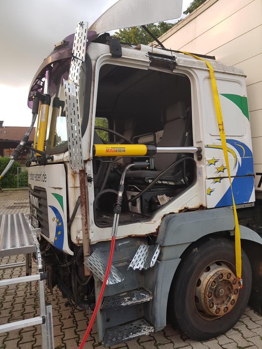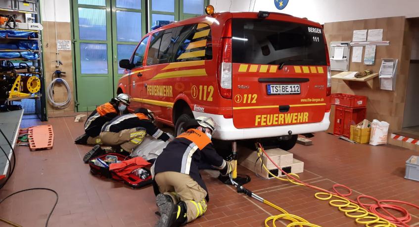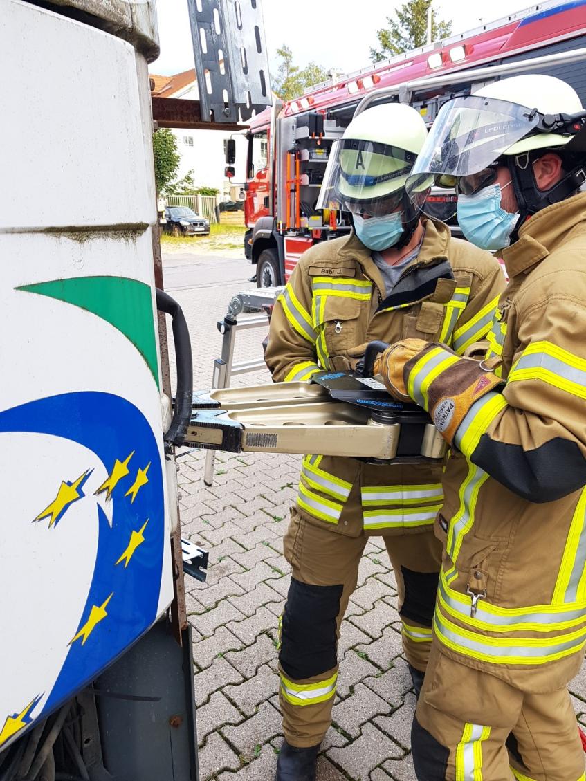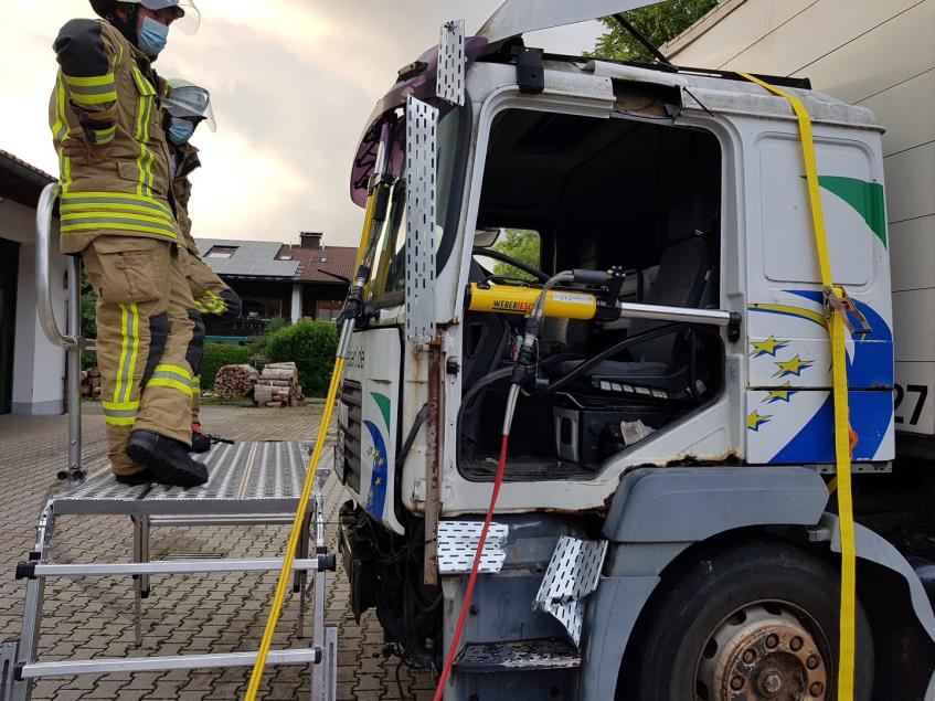 Um Erfahrung mit den wegen CONVID19 nötigen Einschränkungen und Hygienemaßnahmen zu sammeln, wurde der Übungsbetrieb vorerst mit 2 Staffeln (je 6 Mann) begonnen, die abwechselnd immer Montags üben. Während sich die 1. Staffel mit dem Thema "Heben und Unterbauen" beschäftigte, konnte die 2. Staffel sich die Grundlagen bei einem LKW-Unfall aneignen. Dazu wurde der kürzlich umgebaute Übungs-LKW verwendet.
