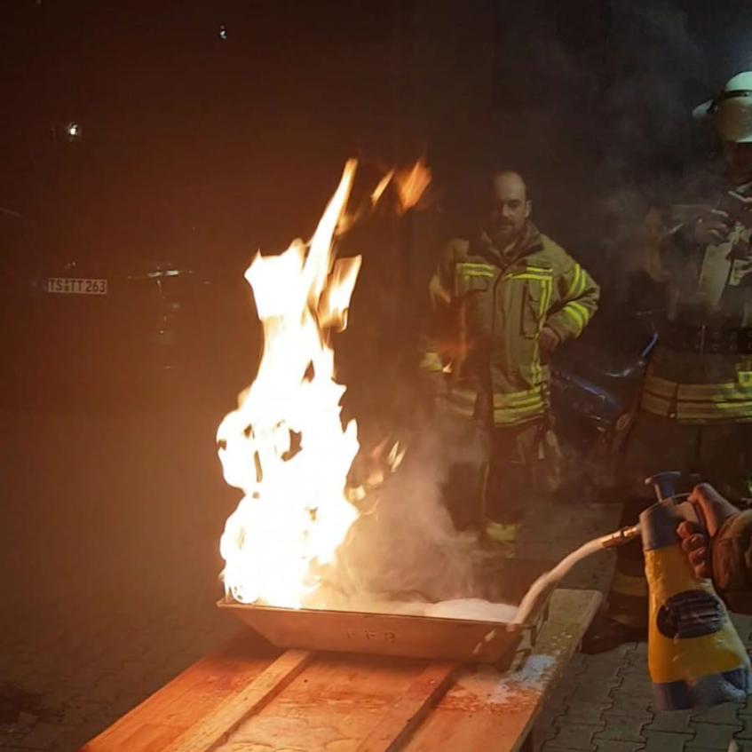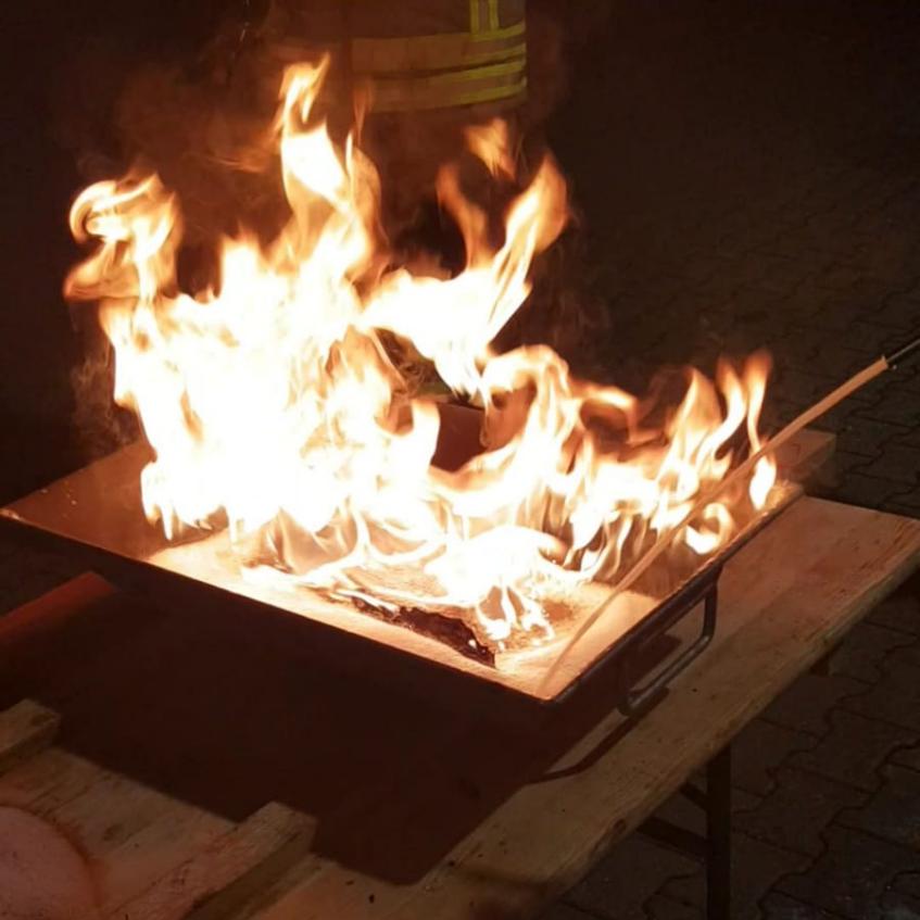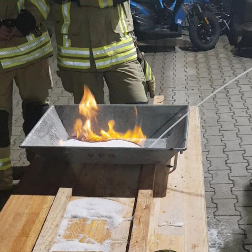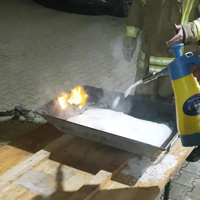 Nach einer kurzen theoretischen Einführung durch 1. Kdt. Tobias Schwaiger konnten die Aktiven die Handhabung und Löschtaktik von Netzmittel, Mittelschaum und Schwerschaum an verschieden, brennenden Stoffen üben. Dazu wurde der vor kurzem beschaffte Schaumsimulator mit Miniaturstrahlrohren verschiedener Ausführungen (Hohlstrahlrohr, Mittelschaum- und Schwerschaumrohr) verwendet. Was im großen nur schwer für Übungen darzustellen ist, z.B. einen ausgedehnten Flüssigkeitsbrand mit Treibstoffen, kann hier in einer einfachen Schuttmulde simuliert werden und somit auch die nötigen Fähigkeiten wie Ankerpunkt setzen und das Aufschieben des Schaumteppich über die Flüssigkeit. Ebenso darstellen lässt sich damit auch die Rückzündungsgefahr, wenn der Schaumteppich nach dem Ablöschen nicht ständig erneuert wird, da dieser langsam von der noch heißen Flüssigkeit zerstört wird. Ein weiterer, positiver Nebeneffekt ist der geringe Einsatz von Schaummittel, was wiederum der Umwelt zugute kommt.