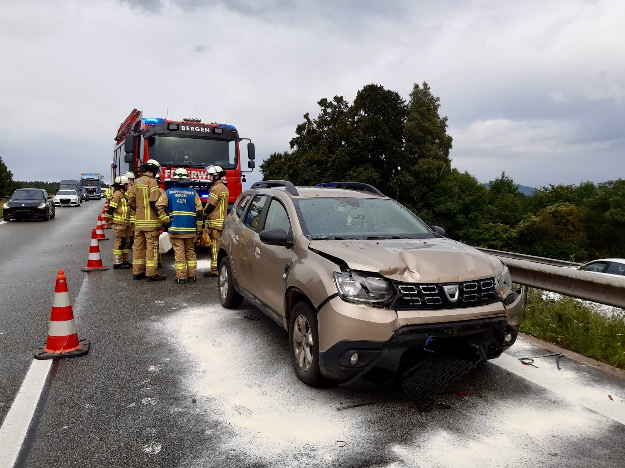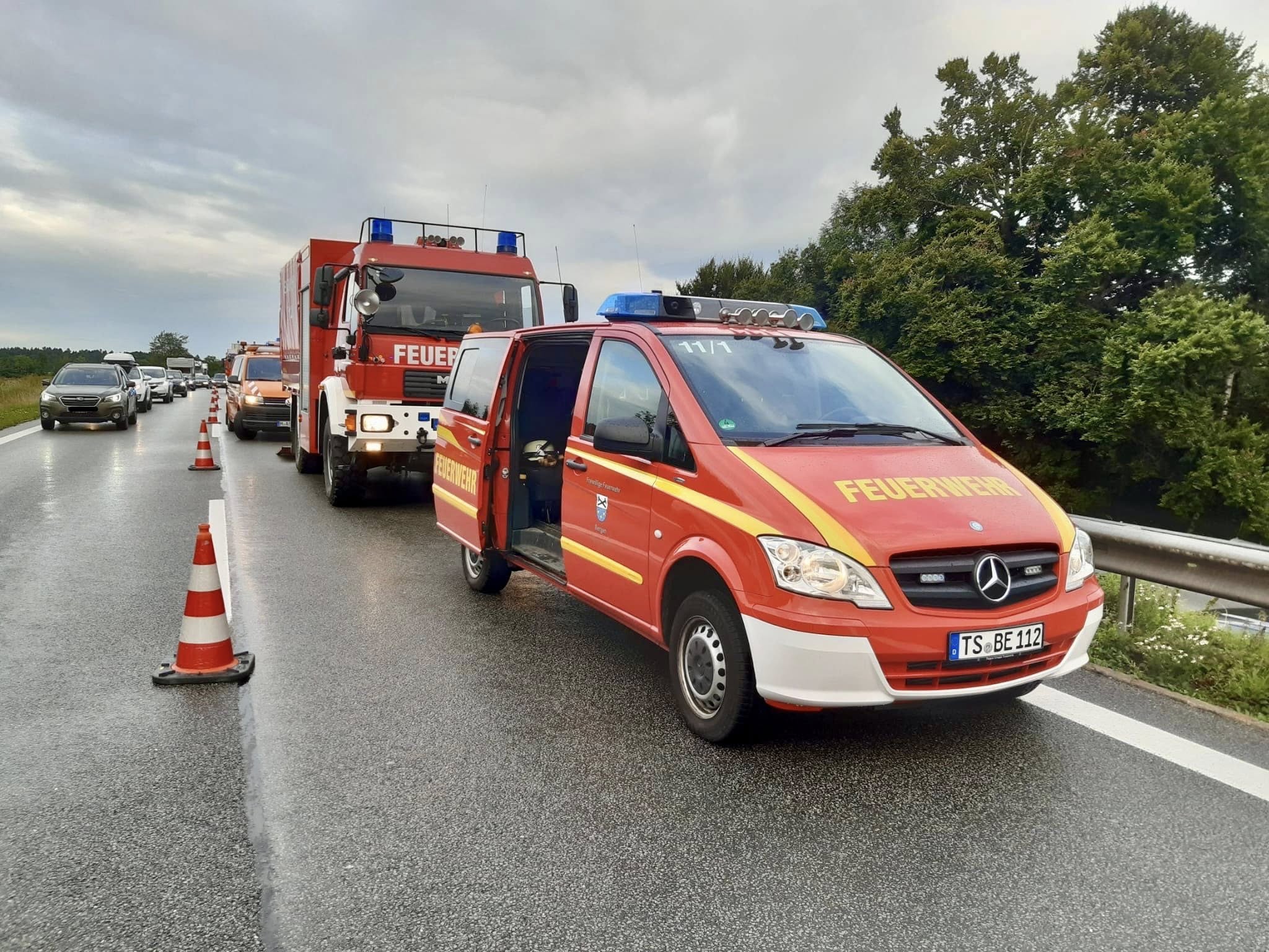 Gegen 18 Uhr rückten wir zu einem THL2 aus: Auf der Autobahn hatte es zwischen Bergen und Grabenstätt in Fahrtrichtung München einen Auffahrunfall gegeben. Daran waren vier Pkws beteiligt. Der Fahrer des hintersten Autos hatte den stockenden Verkehr zu spät erkannt. Er konnte nicht mehr rechtzeitig bremsen und schob die drei vorausfahrenden Fahrzeuge aufeinander. Von den insgesamt zehn Insassen der vier Autos wurde glücklicherweise nur eine Person leicht verletzt. Der Rettungsdienst kümmerte sich, musste aber niemanden ins Krankenhaus bringen.