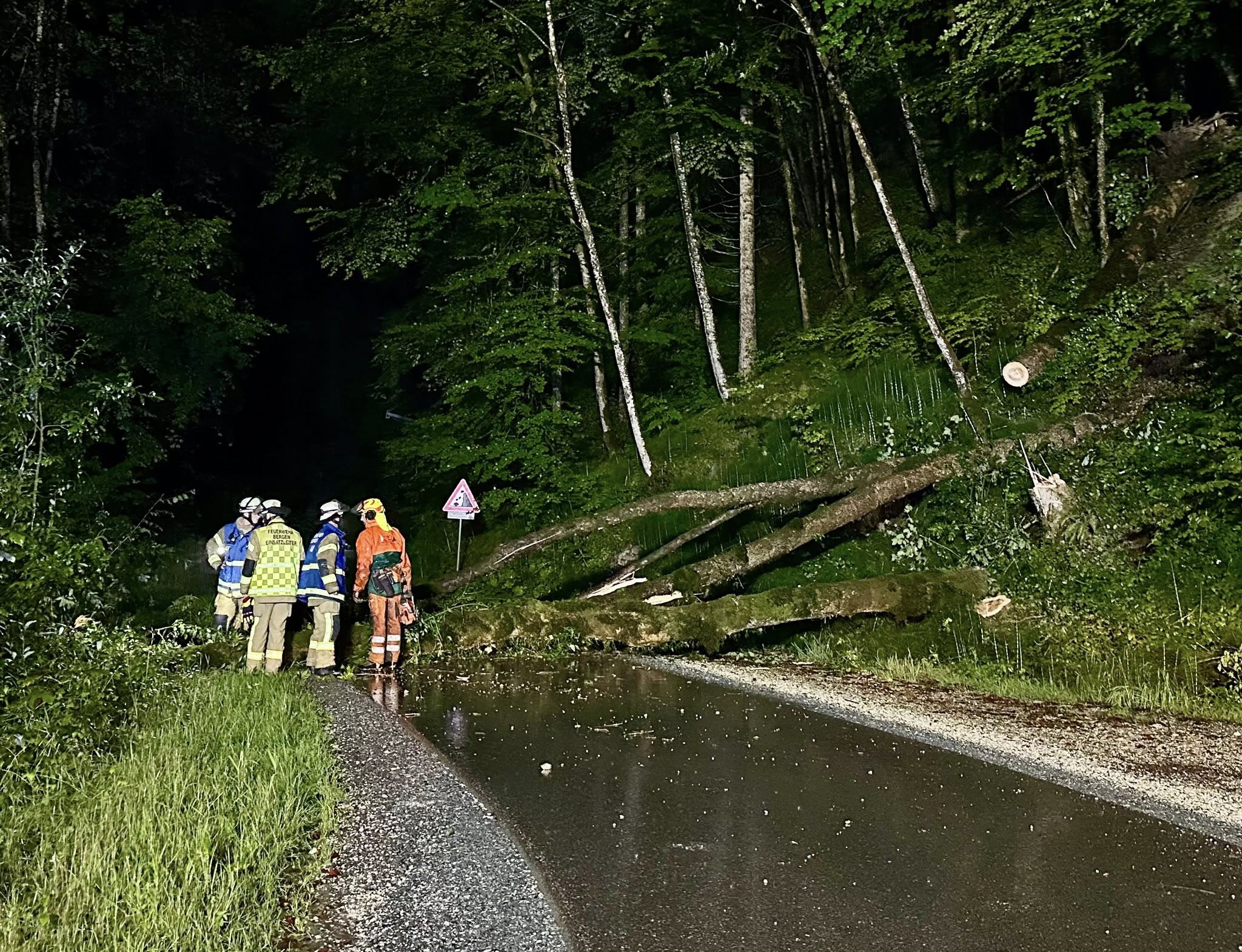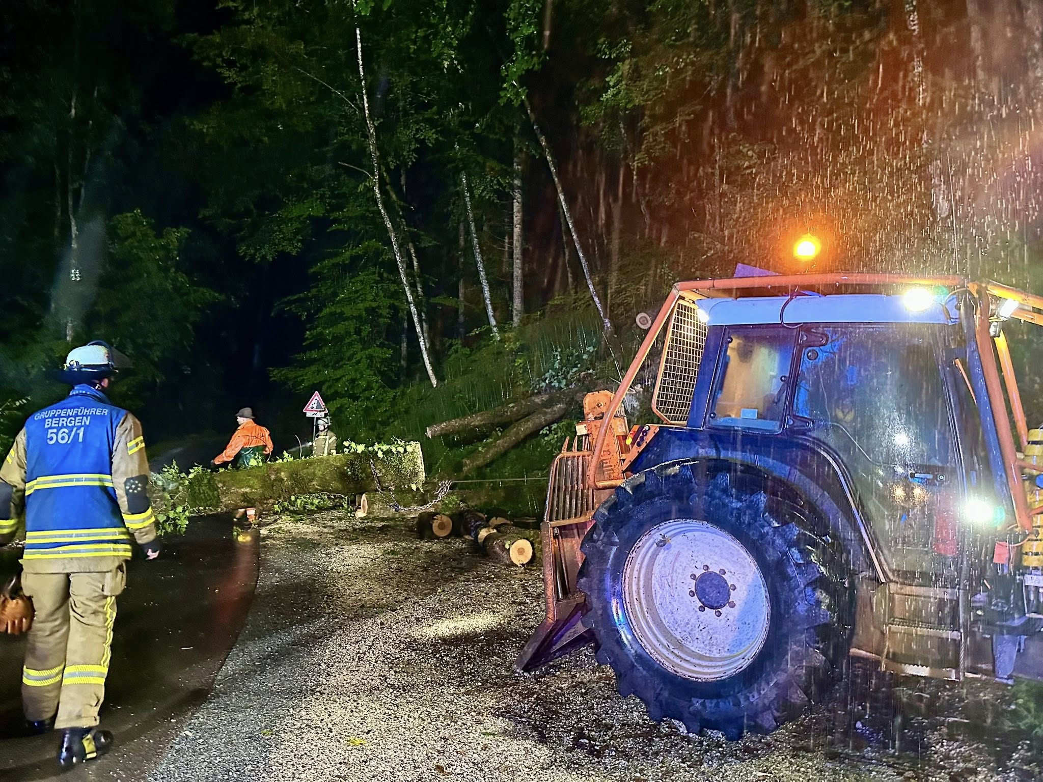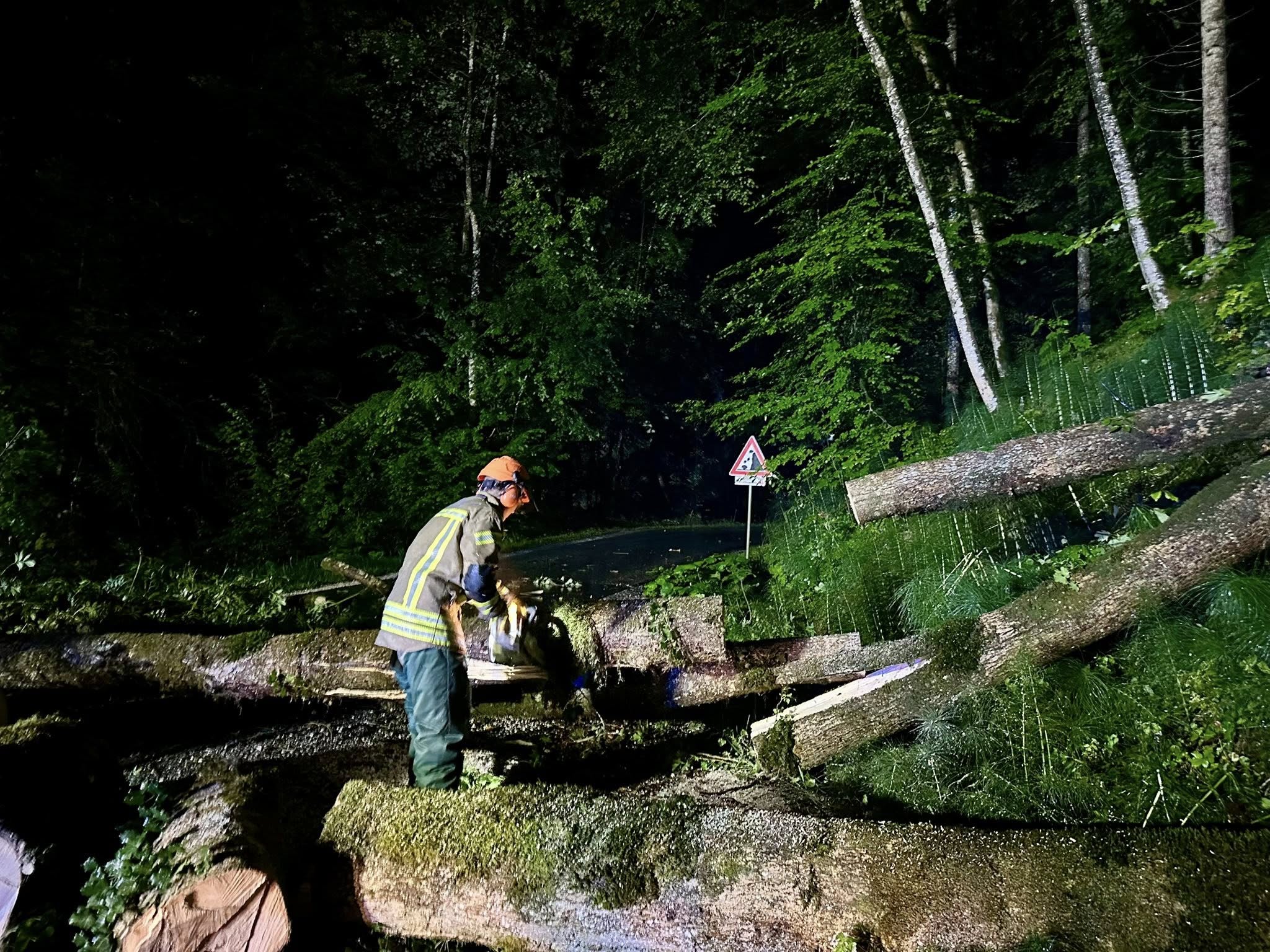 Bei unserem zweiten Einsatz am 21.8. war ein Baum auf die Verbindungsstraße Richtung Kohlstatt gestürzt. Wir entfernten den Baum und reinigten die Straße. Außerdem musste eine Sicherheitsfällung eines weiteren, in Mitleidenschaft gezogenen Baums vorgenommen werden. Ein örtliches Forstunternehmen unterstützte mit einem Traktor mit Seilwinde.