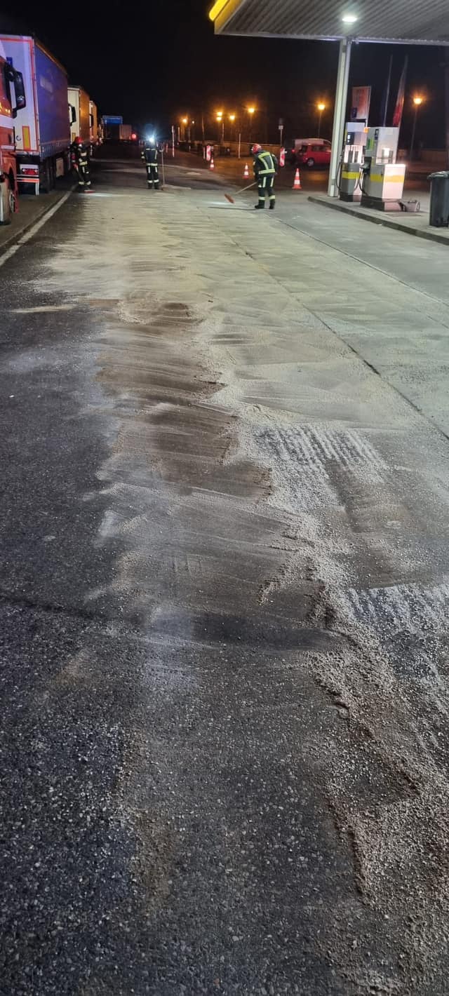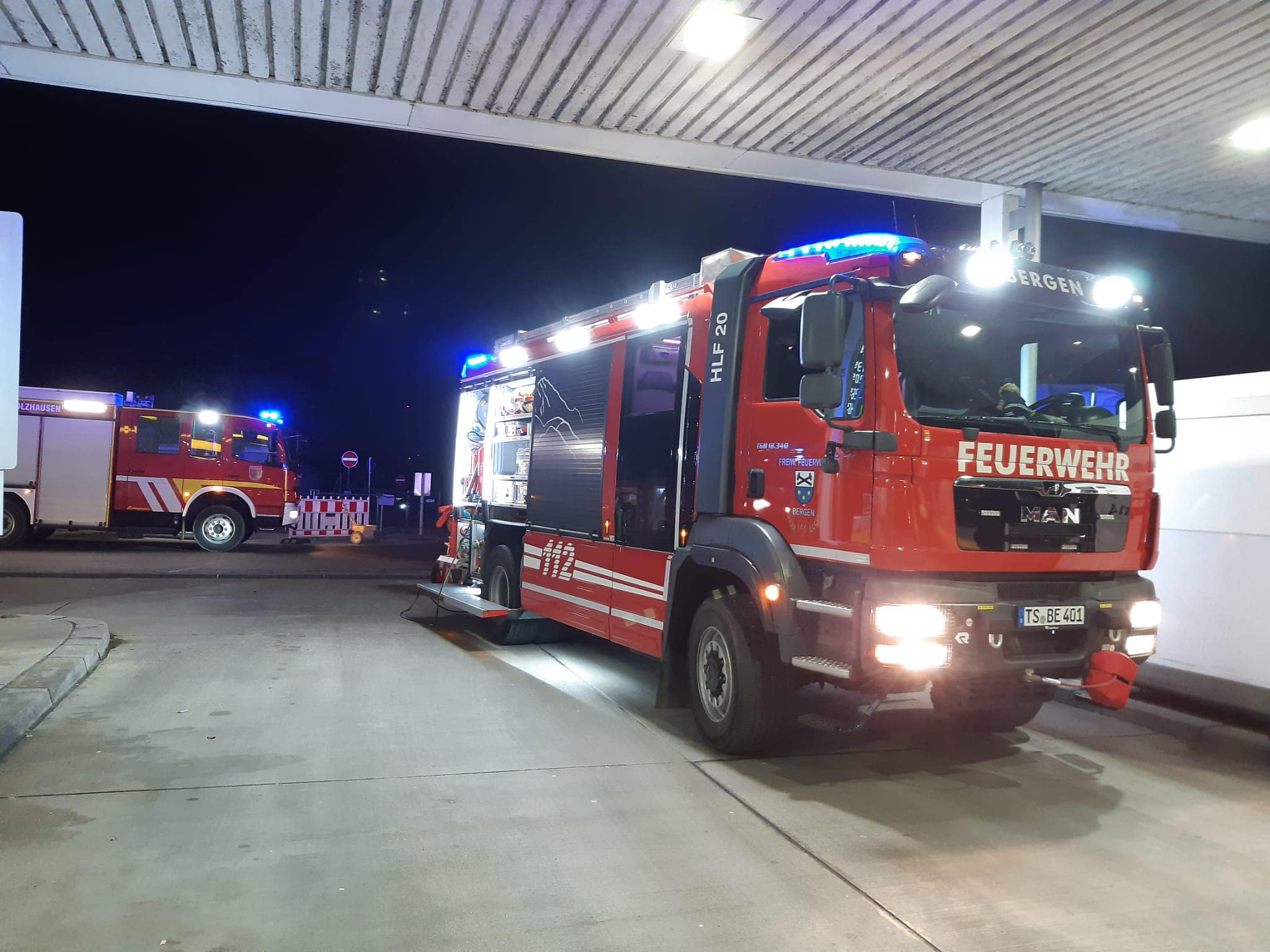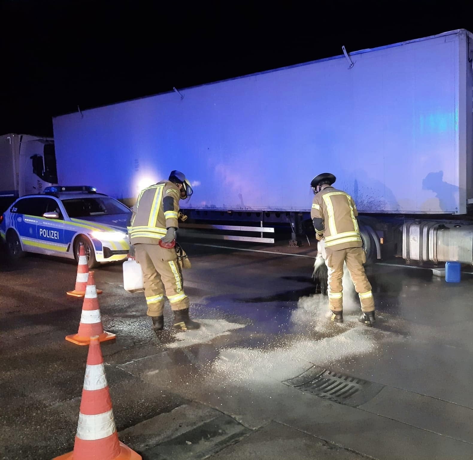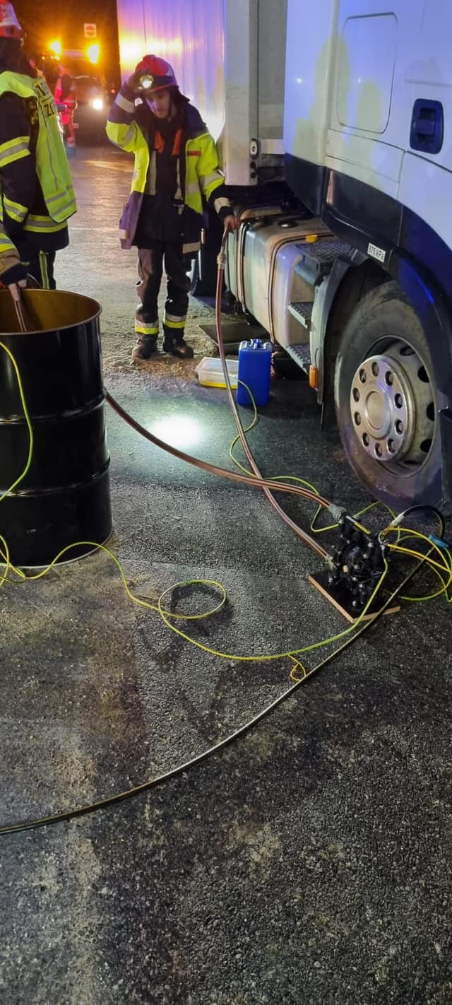 Weitere vorbeifahrende Fahrzeuge hatten den ausgelaufenen Kraftstoff mit ihren Reifen außerdem auf einer Fläche von etwa 100x20 Metern verteilt. Zusammen mit den Holzhausener Einsatzkräften banden wir die Dieselspur, reinigten die Fahrbahn und pumpten den Rest Kraftstoff aus dem kaputten Tank um.