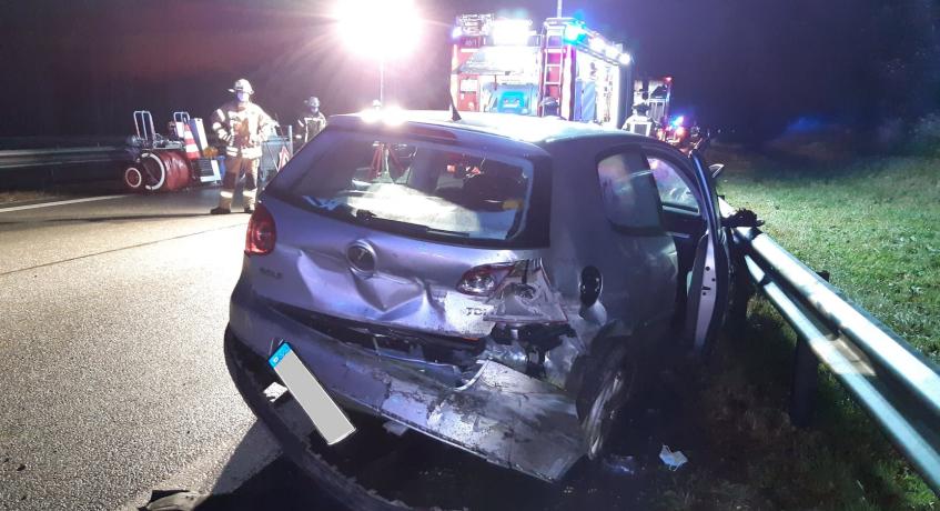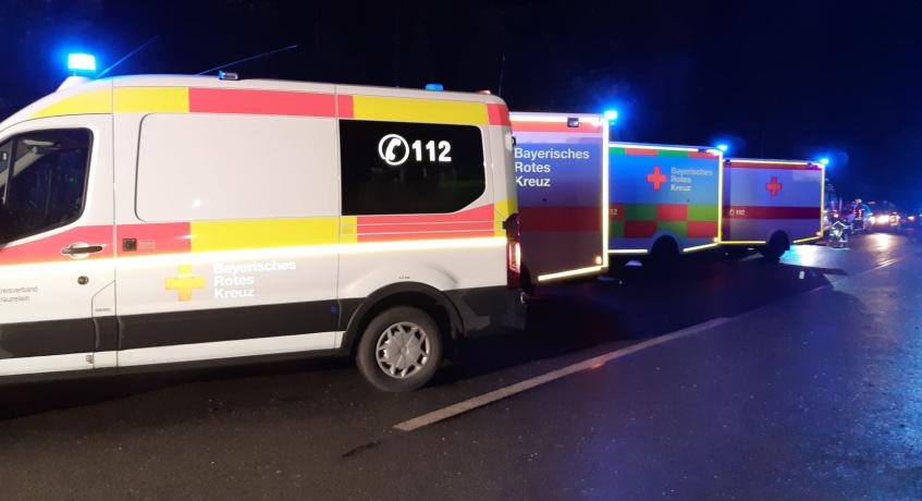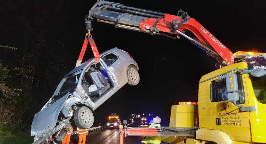Zwei PKW waren aus noch ungeklärter Ursache miteinander kollidiert und schleuderten mehrfach gegen die Leitplanken, bevor sie auf der Fahrbahn liegen blieben. Die Fahrerin in einem PKW wurde dabei in ihrem Auto eingeschlossen und musste von der Feuerwehr Bergen mit dem hydraulischen Rettungsspreizer befreit werden. Insgesamt befanden sich 8 Personen in den beiden Autos, von denen eine Person schwer und 7 Personen leicht verletzt in die umliegenden Krankenhäuser eingeliefert wurden. Die Feuerwehr Bergen übernahm die Patientenbetreuung bis zum Eintreffen des Rettungsdienstes, leuchtete die Unfallstelle aus, streute ausgelaufene Betriebsstoffe ab und reinigte die Fahrbahn. Neben der Feuerwehr Bergen war noch die Freiwillige Feuerwehr Siegsdorf mit ihrem Verkehrssicherungsanhänger an der Einsatzstelle. Die ebenfalls alarmierten Feuerwehren Holzhausen und Grabenstätt konnten aus dem Bereitstellungsraum wieder in ihre Feuerwachen zurückkehren.