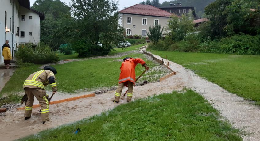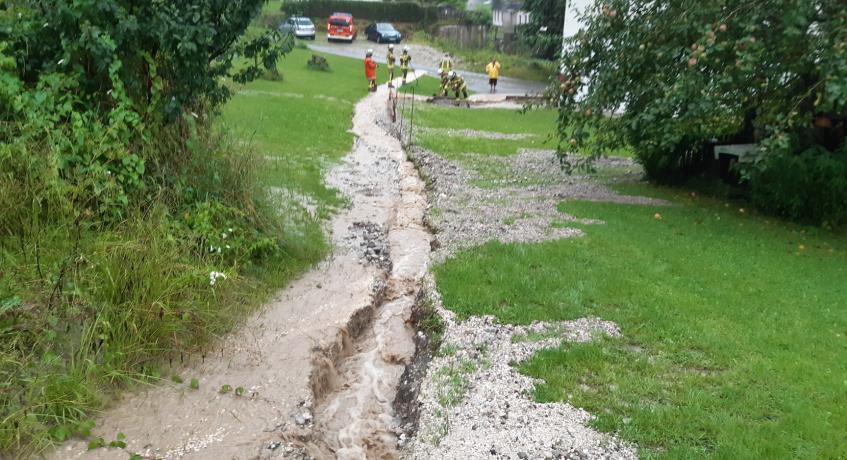 04./05.08.2020 Neben überfluteten Straßen, die gesperrt werden mussten, von Überflutung bedrohte Häuser, die mit Sandsäcken geschützt wurden, mehrere vollgelaufene Keller, die ausgepumpt werden mussten, bis hin zu Murenabgängen war das gesamte Hochwassereinsatzspektrum abzuarbeiten.