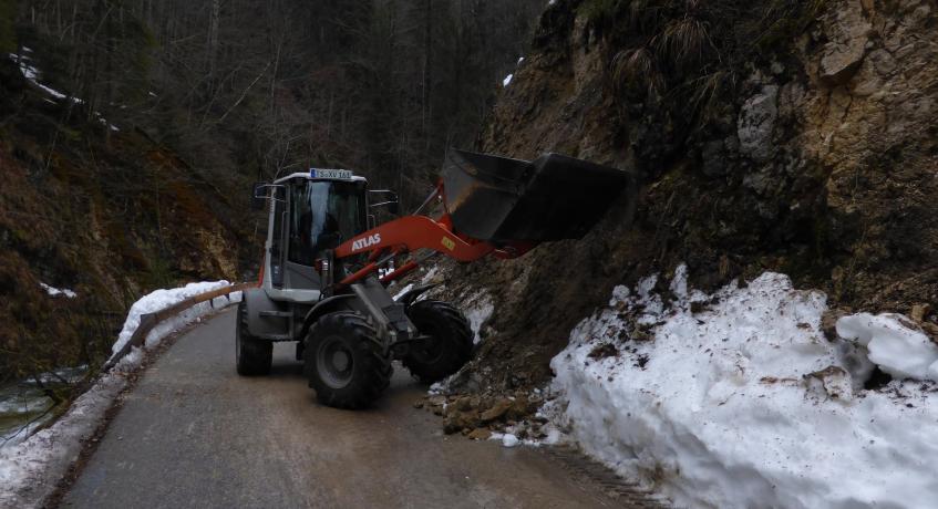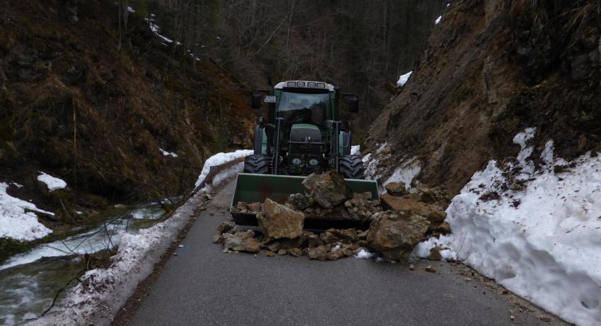 Mehrere größere Steinbrocken lösten sich von der Böschung und versperrten die Straße. Die Feuerwehr und der Bauhof Bergen beseitigten die Steine mit schwerem Räumgerät. Während der Arbeiten wurde die Straße von der Feuerwehr für den Verkehr komplett gesperrt. Nach der Begutachtung der Böschung durch einen Geologen konnte die Straße wieder freigegeben werden.
