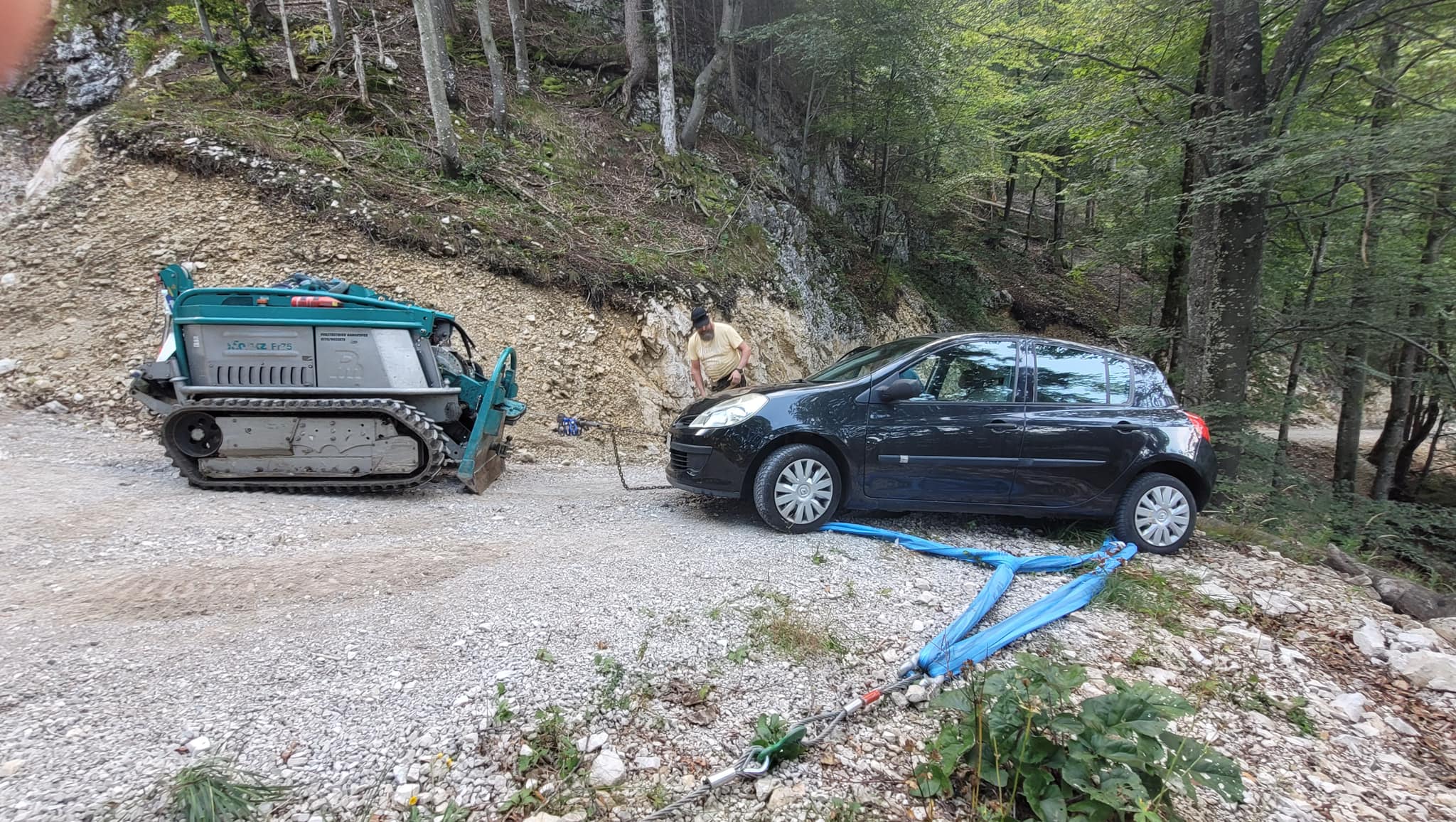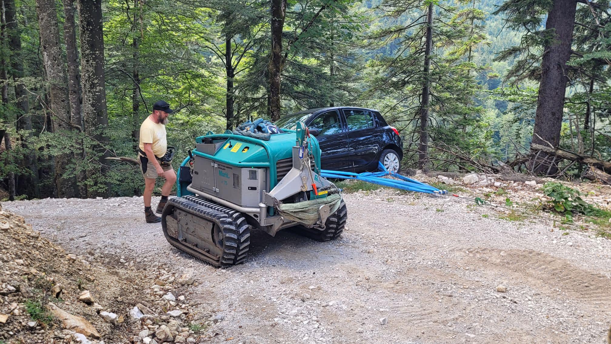 Durch das Spezialgerät konnte das Auto wieder auf die Forststrasse gezogen werden und auch gesichert zum
