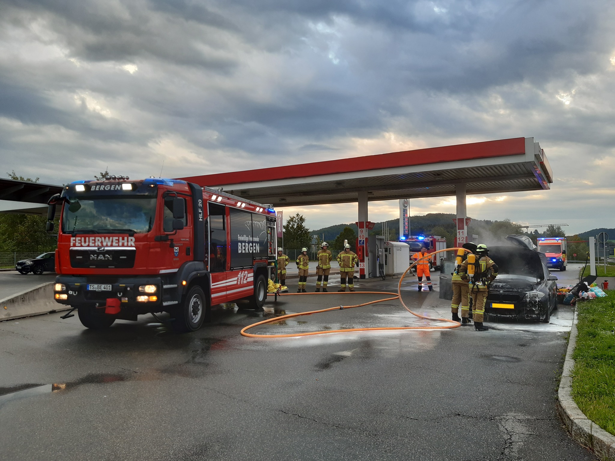 Die Feuerwehren Bergen und Holzhausen wurden am Morgen des 25. August zu einem PKW-Brand an die Raststätte Hochfelln-Nord alarmiert. Vermutlich aufgrund eines technischen Defekts entwickelte sich im Motorraum eines niederländischen PKWs ein Brand. Der Fahrer konnte noch die Autobahn verlassen und stellte das Fahrzeug an der Raststätte ab. Bis zum Eintreffen der Feuerwehr konnte der Brand mit einem Feuerlöscher eingedämmt werden. Die Feuerwehr Bergen löschte unter Atemschutz den Fahrzeugbrand komplett ab und kontrollierte den Brandherd mit der Wärmebildkamera. Die Fahrzeuginsassen blieben glücklicherweise alle unverletzt.