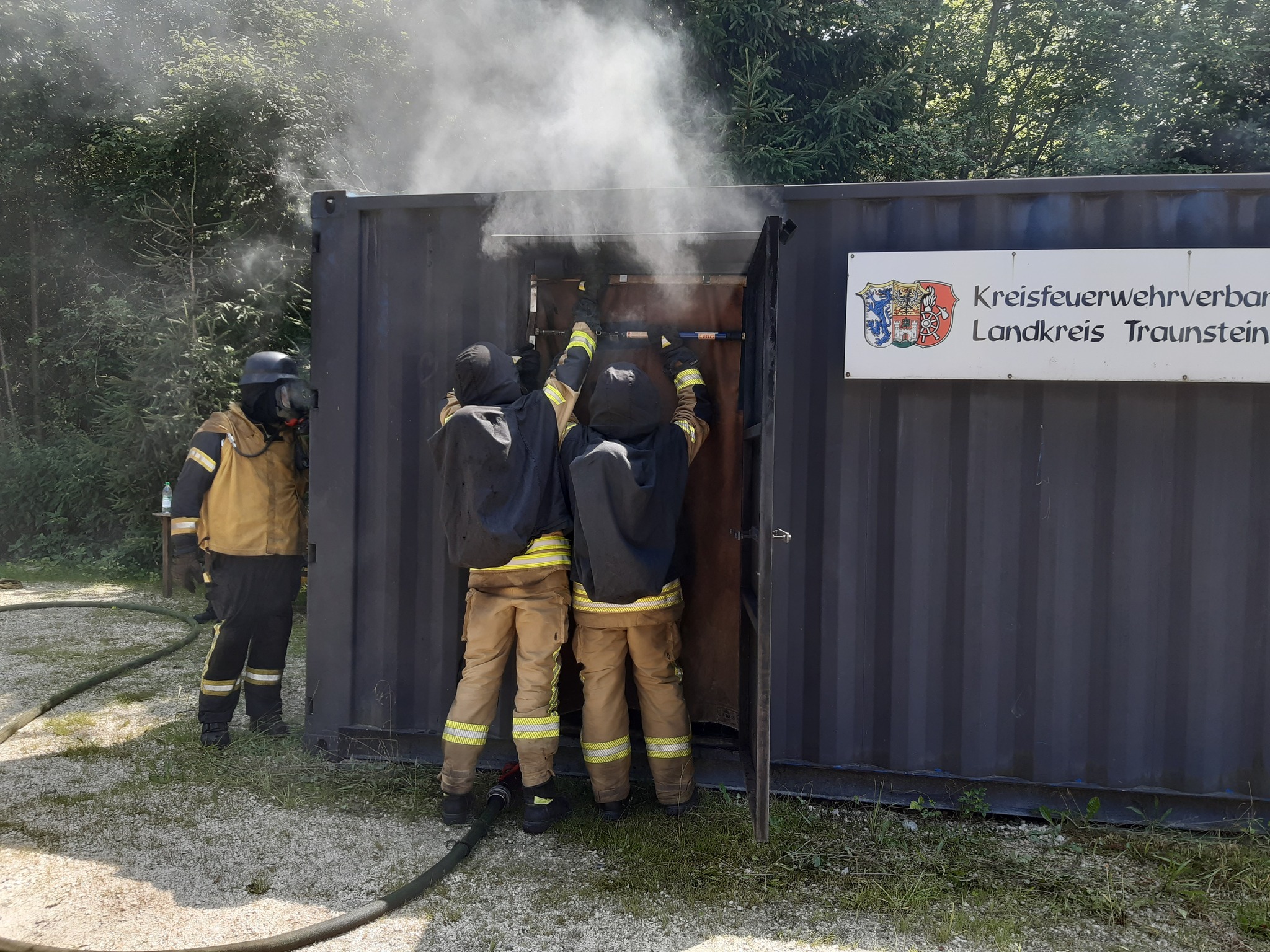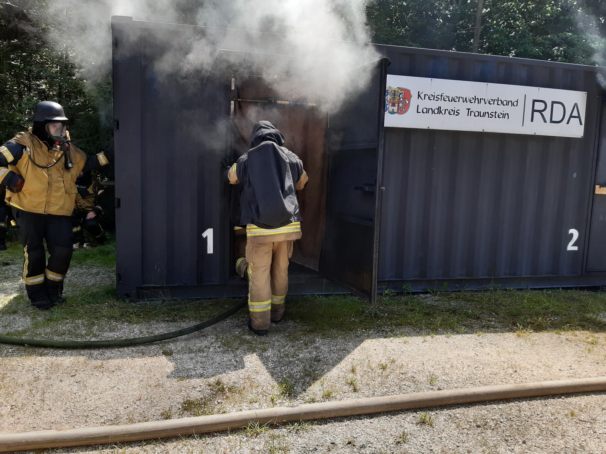 Unsere beiden Feuerwehrkameraden Elias Krammer und Andreas Meindl nahmen am heutigen Samstag 12. Juli erfolgreich an einer Realbrandausbildung in der Rauchgasdurchzündungsanlage (RDA) in Übersee teil. Den Schwerpunkt des Lehrgangs bildeten die Durchgänge im Brandcontainer, bei denen alle Phasen eines Brandes vom Entstehungsbrand bis zum Vollbrand und die damit verbundenen verschiedenen Rauchschichten demonstriert wurden. Dabei wurde auch gezeigt, wie eine Rauchgasdurchzündung entsteht, wie sich der Atemschutztrupp dagegen schützen kann und wie er bereits im Vorfeld die Gefahrensituation erkennen und durch den richtigen Einsatz von Löschwasser entschärfen kann. Begleitend wurde den Teilnehmern ein Strahlrohrtraining und verschiedene Möglichkeiten der Türöffnung vermittelt.