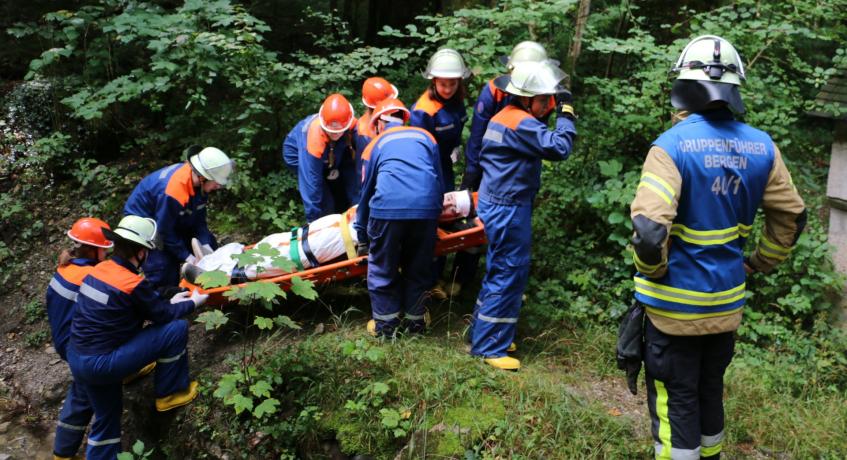 Der erste Einsatz lies nicht lange auf sich warten und führte die Jugendgruppe zu einem Radfahrer, der in den Maria Ecker Bach gestürzt war. Nachdem der Radfahrer erstversorgt war, wurde er mittels einer Schleifkorbtrage gerettet und dem Rettungsdienst übergeben.