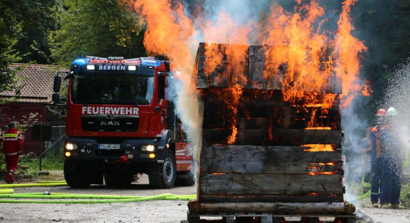 Nach dem Mittagessen stand für die Mannschaft eine Erste Hilfe Ausbildung mit der Wasserwacht Ortsgruppe Bergen auf dem Programm, ehe ein Brand einer Gartenhütte im Wertstoffhof gemeldet wurde.